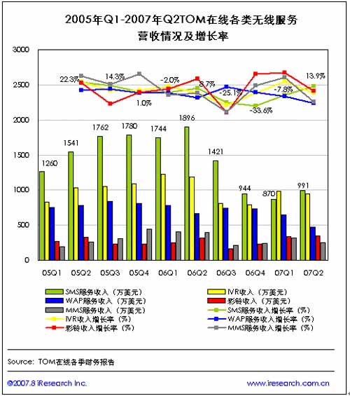 隨后,各無線服務收入則基本處于下滑趨勢,在2007年第二季度,除短信服務收入達到991萬美元,較上一季度增長13.9%之外,MMS收入僅246萬美元,環(huán)比減少23.1%,WAP服務收入為471萬美元,環(huán)比減少27.3%。