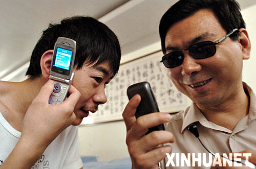 兩位盲人在用盲人專用手機(jī)收發(fā)短信