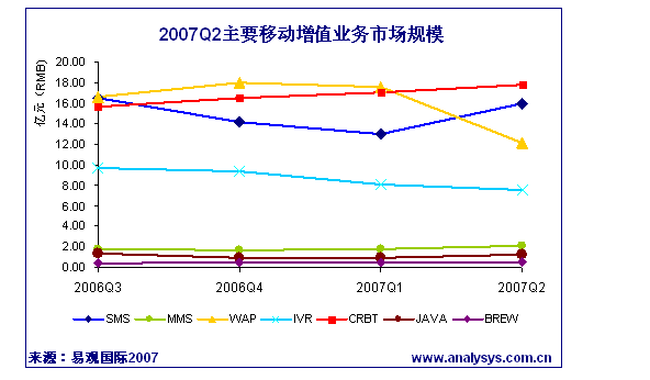 2007年第2季度移動(dòng)增值服務(wù)市場(chǎng)規(guī)模達(dá)57.42億元 WAP業(yè)務(wù)收入極速下滑