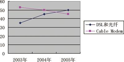 市場研究公司ParksAssociates最新發(fā)布的研究報告稱,2007年美國住宅用戶的寬帶網(wǎng)普及率將超過50%,美國住宅寬帶網(wǎng)用戶將超過6000萬,這些用戶都可以通過寬帶接入享受三種業(yè)務捆綁服務。由于電信公司的寬帶接入技術(shù)占優(yōu)勢,因而在三種業(yè)務捆綁服務方面,電信公司占有競爭優(yōu)勢。所以,凡是在兩家有競爭的地方,有線電視公司都無例外地降低了價格,并失去了相當一部分傳統(tǒng)市場。