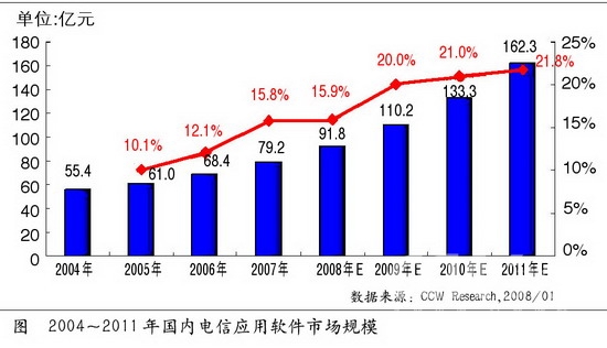 3G是中國未來通信建設(shè)的重點。隨著3G發(fā)展趨勢逐漸明朗化,為了有效地對3G網(wǎng)絡(luò)進行支撐和管理,針對3G業(yè)務(wù)的IT系統(tǒng)建設(shè)也逐漸成為運營商信息化的重點建設(shè)項目。BSS、OSS和MSS將成為這次建設(shè)的主要方向,今后相當(dāng)長的一段時間內(nèi),計費賬務(wù)系統(tǒng)、經(jīng)營分析與決策系統(tǒng)、網(wǎng)絡(luò)資源管理系統(tǒng)、客戶關(guān)系管理系統(tǒng)等將成為國內(nèi)電信運營商建設(shè)或規(guī)劃的重點。根據(jù)計世資訊調(diào)查顯示,2007~2011年,在3G建設(shè)全面展開后,電信應(yīng)用軟件市場的市場規(guī)模累積將達到將近500億元的市場份額。
