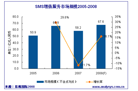 2007年SMS增值服務(wù)的市場規(guī)模(不含點(diǎn)對點(diǎn))達(dá)到58.2億,環(huán)比下降了11.7% ,市場下降的主要原因包括: