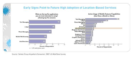 當(dāng)美國(guó)聯(lián)邦通信委員會(huì)(FCC)在2001年強(qiáng)制要求實(shí)施911增強(qiáng)功能時(shí),移動(dòng)行業(yè)就開始通過將導(dǎo)航服務(wù)引入大眾市場(chǎng)來獲利。7年后,絕大多數(shù)手機(jī)都集成了GPS功能,幾大主要的移動(dòng)運(yùn)營(yíng)商也都計(jì)劃在年內(nèi)推出至少一項(xiàng)基于GPS 的導(dǎo)航應(yīng)用。揚(yáng)基集團(tuán)認(rèn)為,2008年正在成為美位置服務(wù)的轉(zhuǎn)折點(diǎn)。