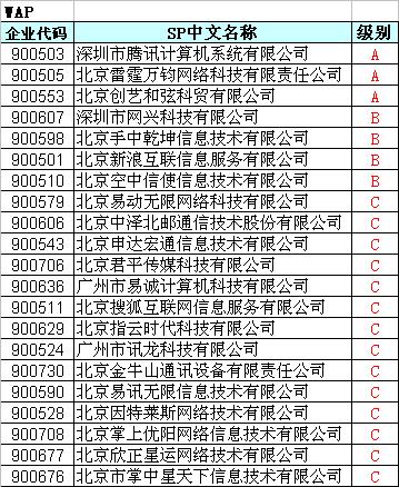 從榜單上可以看到,在短信業(yè)務(wù)上,北京星潮在線文化發(fā)展有限公司、北京雷霆萬鈞網(wǎng)絡(luò)科技有限責(zé)任公司和南京網(wǎng)典科技有限公司獲A評(píng)級(jí)。深圳市騰訊計(jì)算機(jī)系統(tǒng)有限公司、北京雷霆萬鈞網(wǎng)絡(luò)科技有限責(zé)任公司和北京創(chuàng)藝和弦科貿(mào)有限公司獲得WAP業(yè)務(wù)的A評(píng)級(jí)。