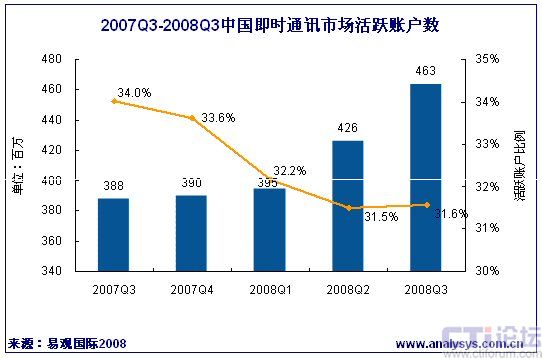 2008年第3季中國(guó)即時(shí)通訊活躍帳戶(hù)數(shù)達(dá)4.63億