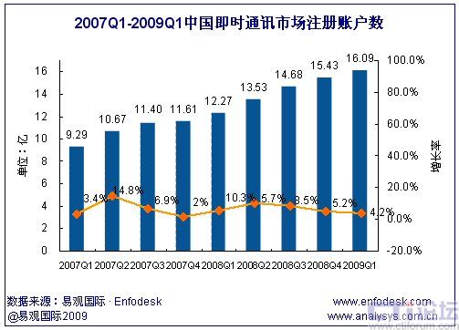 2009年第1季度中國(guó)即時(shí)通訊市場(chǎng)累計(jì)注冊(cè)賬戶(hù)數(shù)達(dá)16.1億