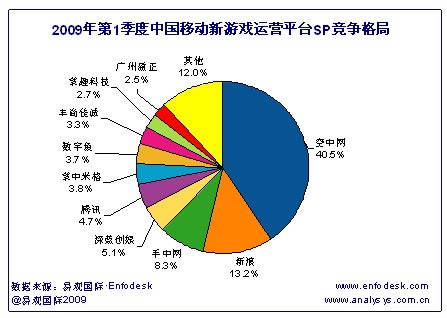 據(jù)易觀國際Enfodesk產業(yè)數(shù)據(jù)庫中《2009年第2季度中國手機游戲市場季度監(jiān)測》顯示:2009年第1季度中國移動的手機游戲服務信息費收入達1.86億人民幣,其中中國移動新游戲運營管理平臺的信息費收入占總體收入的12.41%,達2310萬元人民幣。