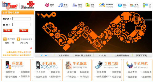 該網站分為資訊、音樂、游戲、彩信、WoStore、社區(qū)、影視、3G等幾類。其中,進入WoStore類別還有通信類、信息類、娛樂類、商務類、音樂類的細分,主要提供聯(lián)通目前已有的相關增值業(yè)務。