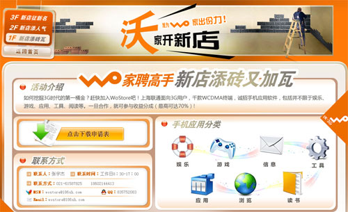 上海聯(lián)通在該網站特別設定“我家開新店”版塊,為新店征名,同時尋求軟件開發(fā)伙伴,并稱包括不限于娛樂、游戲、應用、工具、閱讀等類別,一旦合作就可參與收益分成,最高可達70%。