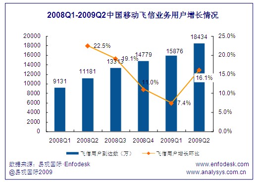 截至2009年第2季度,中國(guó)移動(dòng)飛信用戶到達(dá)數(shù)達(dá)1.84億,環(huán)比增長(zhǎng)16.1%,與2008年第2季度的1.12億用戶到達(dá)數(shù)相比同比增長(zhǎng)64.9%,可見飛信用戶規(guī)模增長(zhǎng)的速度十分迅速,究其原因一方面在于飛信運(yùn)營(yíng)商不遺余力的多渠道營(yíng)銷宣傳,另一方面在于飛信用戶的口碑傳播,由于用戶規(guī)模的增長(zhǎng)帶來更多用戶嘗試體驗(yàn)飛信業(yè)務(wù)。