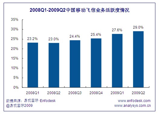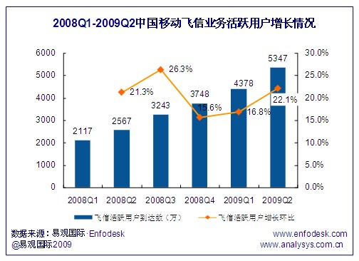 飛信用戶到達(dá)數(shù)的增長(zhǎng)帶來了活躍用戶的穩(wěn)步提升,截止到2009年第2季度,飛信活躍用戶達(dá)到了5347萬,與2008年同期相比增長(zhǎng)超過108.3%。由于一方面飛信到達(dá)數(shù)增長(zhǎng)環(huán)比從2008年第2季度持續(xù)下跌,在2009年第2季度才止跌反彈,相比另一方面飛信活躍用戶的增長(zhǎng)環(huán)比始終保持在15%以上,且從2008年第4季度開始飛信活躍用戶增幅持續(xù)擴(kuò)大,因此近期飛信業(yè)務(wù)用戶活躍度表現(xiàn)出良好的增長(zhǎng)勢(shì)頭。