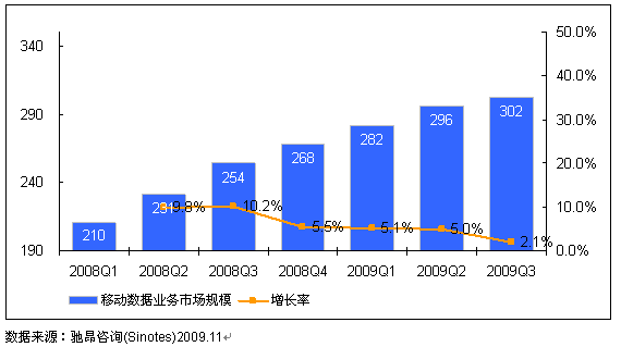 馳昂咨詢(Sinotes)發(fā)布的《2009年中國(guó)移動(dòng)數(shù)據(jù)業(yè)務(wù)市場(chǎng)監(jiān)測(cè)-第三季度》報(bào)告數(shù)據(jù)顯示,2009年Q3中國(guó)移動(dòng)數(shù)據(jù)業(yè)務(wù)市場(chǎng)規(guī)模達(dá)302億元,相比2009年Q2增長(zhǎng)2.1%,表現(xiàn)出了平穩(wěn)增長(zhǎng)的態(tài)勢(shì)。