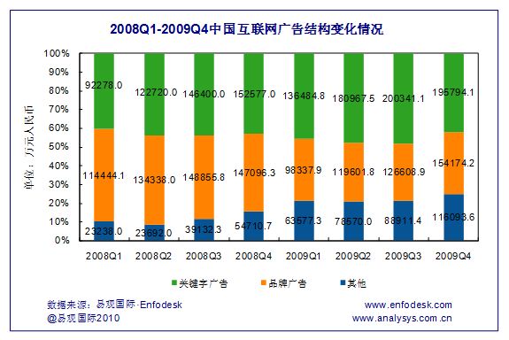 品牌廣告則繼續(xù)保持上升趨勢(shì),2009年第4季度,其市場(chǎng)規(guī)模達(dá)到15.4億元,環(huán)比增長(zhǎng)21.8%,同比小幅上升4.8%。增長(zhǎng)來源主要是快消品、互聯(lián)網(wǎng)產(chǎn)品及服務(wù)以及汽車、通訊行業(yè)等。