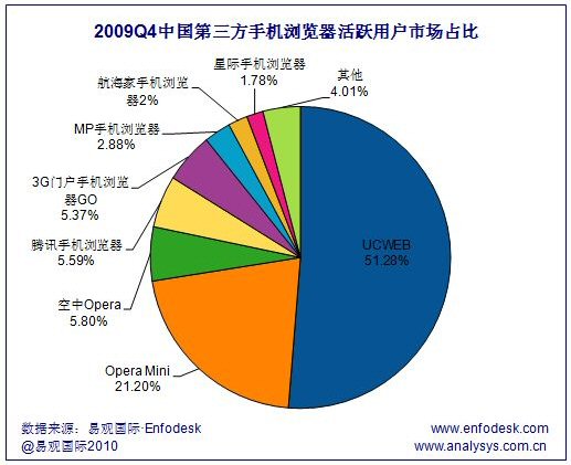 易觀國(guó)際(Analysys International)分析認(rèn)為,2009年4季度中國(guó)手機(jī)瀏覽器市場(chǎng)隨著騰訊、3G門戶等實(shí)力強(qiáng)勁的廠商發(fā)力,搶占用戶的市場(chǎng)競(jìng)爭(zhēng)變得日漸激烈。處于不同手機(jī)瀏覽器陣營(yíng)的廠商都紛紛通過技術(shù)改進(jìn)與大力度的市場(chǎng)營(yíng)銷廣泛推廣自有產(chǎn)品。