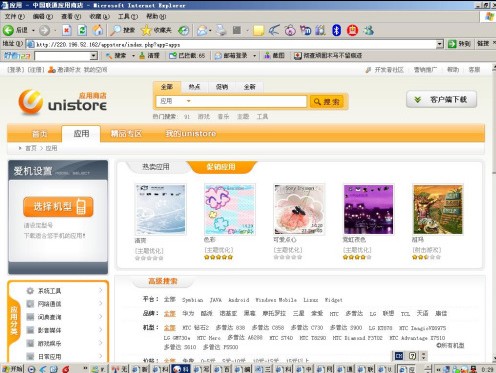 圖:聯(lián)通Unistore手機應用商城測試頁面