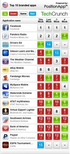 PositionApp提供的數(shù)據(jù)顯示,F(xiàn)acebook長(zhǎng)期位居App Store應(yīng)用商店最流行應(yīng)用的榜首。排名第二的是流媒體音樂網(wǎng)站Pandora的應(yīng)用Pandora Radio,該款應(yīng)用在四周前從第三位上升至第二位,目前占據(jù)第二的位置已有四周時(shí)間。在PositionApp提供的排名中,包括了許多來(lái)自大公司的應(yīng)用。如eBay、社交網(wǎng)站MySpace、美洲銀行、貝寶(PayPal)都位居前列。