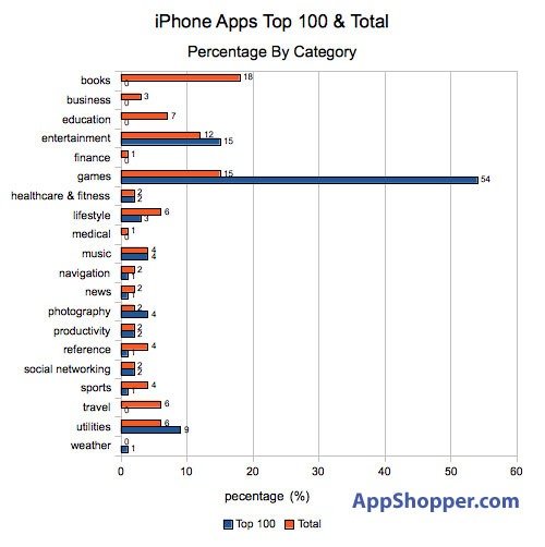 下圖是iPhone和iPod touch的Top100軟件(藍色)與軟件總數(shù)量(橙色)在各個軟件類別中的分布比例?梢钥闯觯