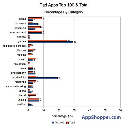 而在iPad的Top100軟件與總應用數(shù)量在各個軟件類別的分布比例圖中: