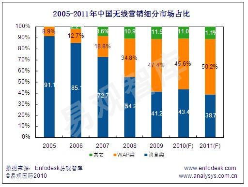 根據Enfodesk易觀智庫近期發(fā)布《中國無線營銷市場專題報告2010》顯示, 2009年中國無線營銷市場WAP類廣告在無線營銷整體占比達47.4%,其規(guī)模同比增長76.8%,與消息類廣告同比下跌1.3%相比WAP類廣告,已成為無線營銷市場最大推動力量。