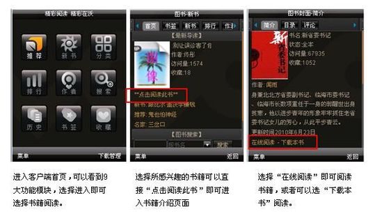 據(jù)了解,中國(guó)聯(lián)通手機(jī)閱讀業(yè)務(wù)分為三個(gè)專(zhuān)區(qū)。目前,圖書(shū)頻道包括16類(lèi)24000余本圖書(shū),雜志頻道包括17類(lèi)500余本雜志。此外,用戶可選擇進(jìn)入聽(tīng)書(shū)頻道,下載并收聽(tīng)圖書(shū)。
