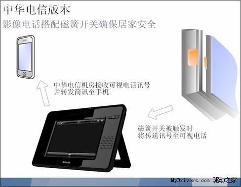 除多媒體服務(wù),AMOR8210內(nèi)建之千里眼服務(wù)更突破業(yè)界標(biāo)準(zhǔn)使其與磁簧開關(guān)整合提供居家安全嶄新服務(wù)。當(dāng)磁簧開關(guān)被觸發(fā)告警時,AMOR8210攝影鏡頭將開啟錄像功能并上傳畫面且同步發(fā)送簡訊至行動電話通知使用者接著使用者可透過3G手機(jī)觀看錄像檔案或直接撥接AMOR8210進(jìn)行實時監(jiān)控。