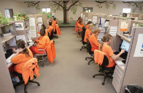 但古德溫邁出了回歸體面人生的艱難步伐,并已獲得了一份工作,4月份刑滿后可上任,這一切都多虧了一家名為威爾帝電信(Televerde)的公司。該公司在佩里維爾監(jiān)獄運(yùn)營著四個呼叫中心,包括250名輪候上班的身著橘黃色連身衣的“女士”(員工們很享受這個稱呼),員工必須接受脫衣搜查,有時還要接受保安的盤問。但一旦戴上耳機(jī),她們就進(jìn)入了另一個世界!霸谀抢锟梢灾厥白宰稹!惫诺聹乇硎,她已為出獄后的生活攢下了8,000美元的儲蓄。威爾帝電信是一家私營企業(yè),董事長詹姆斯·胡克(James