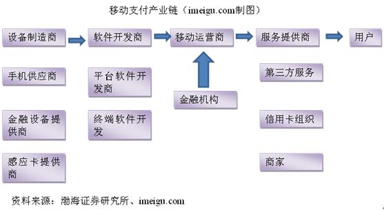 移動支付業(yè)務(wù)產(chǎn)業(yè)鏈主體由設(shè)備制造商、銀行、信用卡組織、移動運營商、移動支付服務(wù)提供商(或移動支付平臺運營商)、商業(yè)機(jī)構(gòu)、SIM卡供應(yīng)商、手機(jī)供應(yīng)商、用戶等多個環(huán)節(jié)組成。