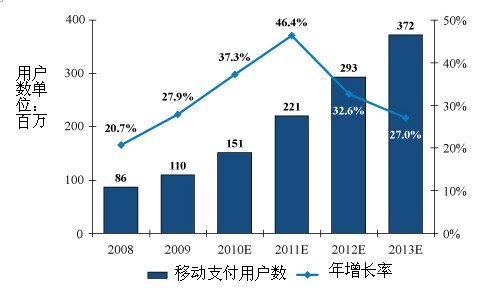 基于“中國計算機(jī)世界”的研究預(yù)測,中國移動支付用戶在2009年底達(dá)到1.1億,預(yù)計將在2013年超過3倍。由于需求大幅提高,電信運營商會繼續(xù)在每個省推出移動支付解決方案網(wǎng)絡(luò)。反過來,也會刺激第三方平臺和供應(yīng)商的發(fā)展。