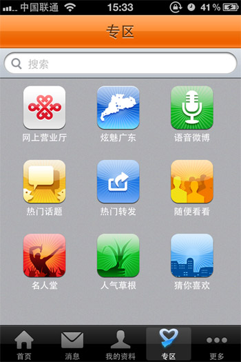 記者在測試中發(fā)現(xiàn),聯(lián)通語音微博整體界面為醒目的聯(lián)通標準色,并內(nèi)置了聯(lián)通專區(qū)、聯(lián)通網(wǎng)上營業(yè)廳、廣東聯(lián)通炫魅廣東等定制應用服務。