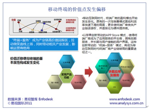 易觀智庫Enfodesk在近期發(fā)布《中國移動(dòng)互聯(lián)網(wǎng)市場年度綜合報(bào)告2011》中認(rèn)為,隨著3G的普及以及多元化移動(dòng)應(yīng)用的出現(xiàn),智能手機(jī)取代功能手機(jī)已成定勢(shì),導(dǎo)致傳統(tǒng)的移動(dòng)終端價(jià)值點(diǎn)開始由產(chǎn)品化向服務(wù)化遷移。終端廠商原有模式也受到極大挑戰(zhàn)。若不進(jìn)行有效轉(zhuǎn)型恐難以在未來2-3年后的手機(jī)市場生存。