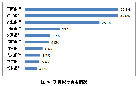 在對手機銀行用戶對手機銀行使用的情況分析來看,工商銀行(601398,股吧)手機銀行的使用率依然最高,達35.1%,建設(shè)銀行(601939,股吧)緊隨其后,為35.0%。通過進一步的分析發(fā)現(xiàn),在經(jīng)常使用手機銀行的用戶中,對建設(shè)銀行手機銀行的使用率(37.4%)略高于對工商銀行的使用率(36.0%),這表明建設(shè)銀行的用戶相對養(yǎng)成了使用手機銀行的習(xí)慣。另外,農(nóng)業(yè)銀行(601288,股吧與中國銀行的使用率在這半年中都有顯著提升,不斷縮小與行業(yè)領(lǐng)跑者的差距。