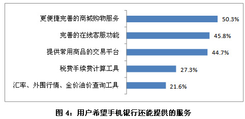 根據(jù)用戶調(diào)研數(shù)據(jù)分析,超過四成的手機銀行用戶能夠接受對金融產(chǎn)品如手機炒股和手機支付實行收費,同時,有約兩成的用戶能夠接受對手機游戲和手機地圖導(dǎo)航實行收費。這表明,對特定的手機應(yīng)用服務(wù)收費能夠得到部分用戶的接受和認可。