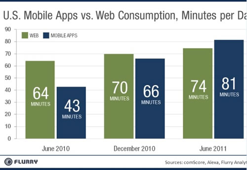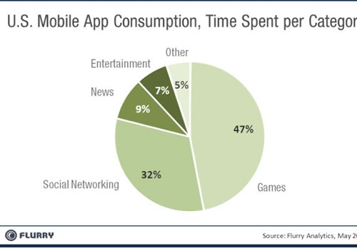 Flurry發(fā)現(xiàn)平均每用戶花在移動應(yīng)用上的時(shí)間比網(wǎng)絡(luò)多出9%。僅在1年前,用戶平均每天在應(yīng)用上花費(fèi)43分鐘,在網(wǎng)絡(luò)上花費(fèi)64分鐘。而現(xiàn)在,用戶在應(yīng)用上的時(shí)間增至81分鐘,增幅達(dá)91%。原因?yàn)橛脩羰褂玫膽?yīng)用類型和數(shù)量增加,而非平均時(shí)長有大幅增加;ㄔ诰W(wǎng)絡(luò)上的時(shí)間增速較緩,目前為74分鐘,同比增長16%。