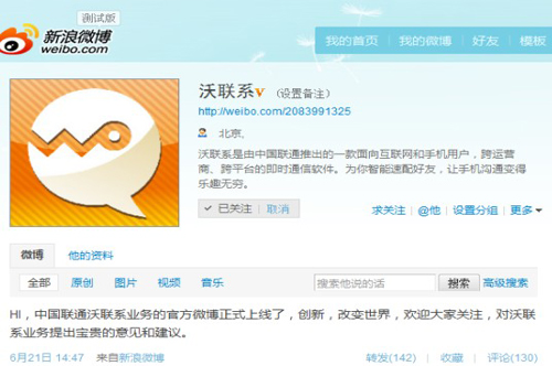 昨日下午,中國聯(lián)通“沃聯(lián)系”業(yè)務(wù)官方微博正式上線,而在稍后晚間,中國聯(lián)通官方微博也對(duì)此微博進(jìn)行推介,并稱“中國聯(lián)通即將推出一款面向互聯(lián)網(wǎng)和手機(jī)用戶,跨運(yùn)營商、跨平臺(tái)的即時(shí)通信軟件‘沃聯(lián)系’。為幫助用戶朋友更好了解和使用這款即將上線的產(chǎn)品,中國聯(lián)通沃聯(lián)系產(chǎn)品組現(xiàn)已開通@沃聯(lián)系新浪官方微博,敬請(qǐng)關(guān)注!