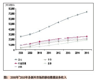 就絕對(duì)值來看亞太地區(qū)的新興市場(chǎng)將占主導(dǎo)地位,該地區(qū)的移動(dòng)數(shù)據(jù)業(yè)務(wù)收入將從2010年的368億美元增長到2015年的734億美元,增長率幾乎為100%。給出這么高的預(yù)測(cè)值不足為奇,因?yàn)樵撌袌?chǎng)上有中國、印度、印尼“三大巨頭”,這三個(gè)國家對(duì)該區(qū)域數(shù)據(jù)業(yè)務(wù)收入的貢獻(xiàn)將達(dá)到81%。