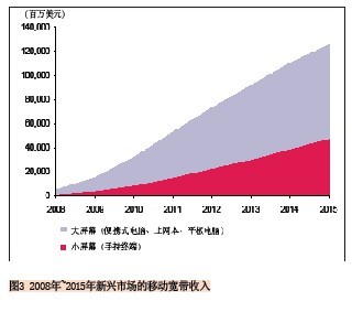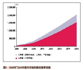 另外一個(gè)預(yù)測(cè)也可說明這一趨勢(shì):2010年到2015年小屏幕移動(dòng)寬帶連接的復(fù)合年均增長率為45%,而大屏幕的復(fù)合年均增長率為36%,到2015年新興市場(chǎng)上將有16億的小屏幕連接和近4.59億的大屏幕連接。