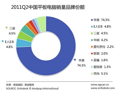 CTI論壇(ctiforum)7月21日消息(記者 楊佳林):根據(jù)易觀智庫最新數(shù)據(jù)顯示,在2011年第2季度蘋果iPad市場銷量份額環(huán)比下滑5.14%,至74.30%。其次是E人E本,占據(jù)了4.82%。三星位列第三。伴隨品牌平板電腦集體上市,以愛國者、藍(lán)魔為代表的消費類電子廠商的平板電腦均收到一定影響,市場銷量和份額均有不同程度下降。