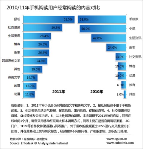 據(jù)易觀國(guó)際(Analysys International)最新報(bào)告《2011年中國(guó)手機(jī)閱讀市場(chǎng)用戶(hù)研究報(bào)告》(以下簡(jiǎn)稱(chēng)《報(bào)告》)研究發(fā)現(xiàn),報(bào)紙、生活資訊、社交資訊等類(lèi)微內(nèi)容超越文學(xué)作品等長(zhǎng)內(nèi)容成為手機(jī)閱讀用戶(hù)的習(xí)慣性閱讀內(nèi)容。