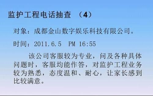 金山游戲客服經(jīng)過6年多的發(fā)展,客服的服務水準和管理日趨完善。楊靜一表示,金山客服的服務理念是“金色心服務”,“金色”代表陽光、溫暖,“心”代表真誠、用心,金色“心”服務就是真誠用心地為玩家服務,讓玩家在服務中感受到陽光與溫暖。