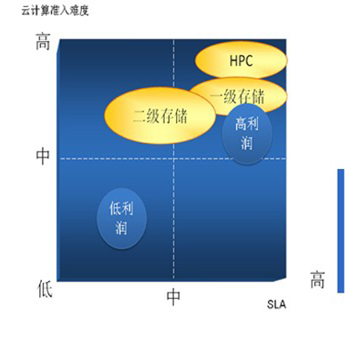 從企業(yè)戰(zhàn)略咨詢分析師的角度,我認為IBM的戰(zhàn)略布局和資源整合策略確實是IT領域戰(zhàn)略規(guī)劃很好的教科書(起碼對于我個人而言)。精準的定位市場、以具有明顯技術細分優(yōu)勢的產(chǎn)品或服務切入市場、設定較高的技術準入門檻,這些戰(zhàn)略舉措不僅有助于IBM快速占領新生市場戰(zhàn)略制高點,同時保證了其可持續(xù)競爭優(yōu)勢和利潤空間。從下面的云計算準入/云服務SLA象限圖上,當很多廠商還在考慮“哪塊云彩有雨”時,IBM已經(jīng)完成在云端提供HPC和高增值二級存儲服務的布局,掌控了利潤最豐厚的云計算高端市場。從我個人的預測,IBM在云端提供一級存儲服務,應該是其云計算高端戰(zhàn)略的下一個布局。