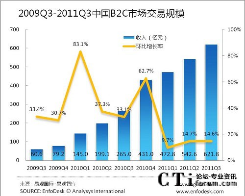 易觀智庫(kù):2011年第3季度中國(guó)B2C整體市場(chǎng)增長(zhǎng)乏力