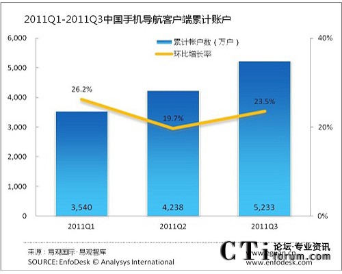 根據(jù)EnfoDesk易觀智庫(kù)最新發(fā)布的數(shù)據(jù)顯示,截止2011年9月底,中國(guó)手機(jī)導(dǎo)航客戶(hù)端累積賬戶(hù)數(shù)為5233萬(wàn),相比2011年第2季度的4238萬(wàn),環(huán)比增長(zhǎng)23.5%。