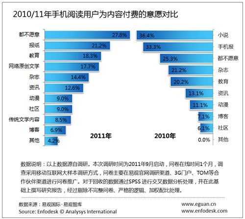 據易觀國際(Analysys International)《2011年中國手機閱讀市場用戶研究報告》研究發(fā)現(xiàn),2011年整體手機閱讀市場付費意愿有所降低。