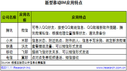 艾瑞研究發(fā)現(xiàn),目前在國內(nèi)市場上的移動IM企業(yè)中,主要分為兩種類型:一種是互聯(lián)網(wǎng)服務(wù)企業(yè)推出的產(chǎn)品,以米聊和微信為代表;另外一種是以電信運(yùn)營商為代表類型的企業(yè)。