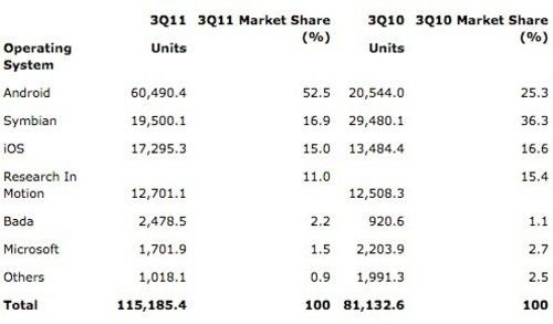Gartner:Android系統(tǒng)份額52.5% 同比2010年翻番