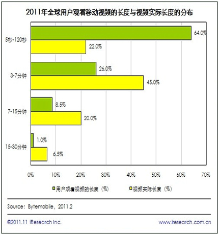 艾瑞咨詢在研究Bytemobile 2011年2月份發(fā)布的全球移動視頻研究的報告中發(fā)現(xiàn),全球有64%的移動視頻只被觀看了不超過2分鐘的時間,而時長在2分鐘以內的移動視頻只有22%,也就是說,相當多的視頻沒有被完整地看完。
