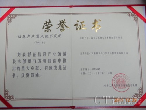 訊飛榮獲2011年第十一屆信息產(chǎn)業(yè)重大技術(shù)發(fā)明獎