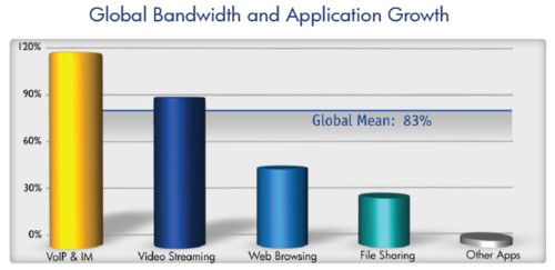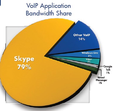 雖然網(wǎng)絡(luò)電話與即時(shí)通訊在下半年的網(wǎng)絡(luò)帶寬中占比仍然很低,它們的申請量證明了其在高速發(fā)展,相比上半年提升了114%。在下半年,Skype占了全球手機(jī)網(wǎng)絡(luò)電話使用量的79%。然而由于新競爭者所帶來的壓力,它的份額根據(jù)上半年的82%有所下降,這些新出來的同行包括Viber,它的迅速成長使其已經(jīng)占到了全球網(wǎng)絡(luò)電話流量的2%,超過了GoogleTalk 及Windows Live(這兩者都占1%)。