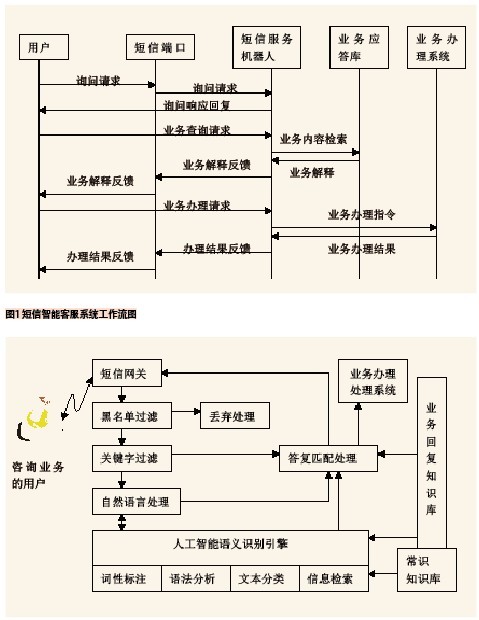 人工智能技術(shù)的引入讓機器能替代人工服務(wù)為用戶提出的問題和請求做出類人的處理和反饋。在計算機系統(tǒng)上實現(xiàn)人工智能的有兩種不同的方式。一種是工程學(xué)方法,采用傳統(tǒng)的編程技術(shù),使系統(tǒng)呈現(xiàn)近似人類智能的輸出結(jié)果,并不考慮所用方法是否與人或動物機體所用的方法相同。另一種是模擬法,它不僅要獲得類人的輸出結(jié)果,還要求實現(xiàn)方法也和人類或生物機體所用的方法相同或相類似。目前主要在工程學(xué)方法實現(xiàn)人工智能中有較成熟的商用技術(shù),短信自助服務(wù)系統(tǒng)也基于該方法實現(xiàn)。