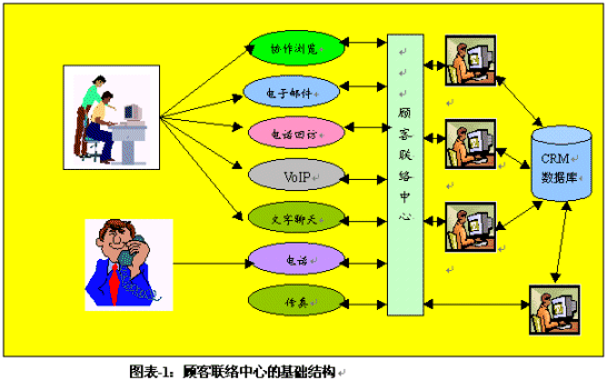 。。呼叫中心通過多年以來的發(fā)展,其傳統(tǒng)型的呼叫中心還是主要在以電話為媒介服務(wù)于顧客。這類呼叫中心的基礎(chǔ)結(jié)構(gòu)包括ACD、IVR、CTI等技術(shù)應(yīng)用平臺和界面,同時與企業(yè)的后臺資源相連接,例如大型或相關(guān)數(shù)據(jù)庫。但是,當今的呼叫中心已經(jīng)發(fā)展成為一個多媒體的服務(wù)或交易渠道,有的還能處理基于互聯(lián)網(wǎng)的垂詢和呼叫,而有的則是一個虛擬的顧客聯(lián)絡(luò)中心,例如圖表-1中描述的那樣: